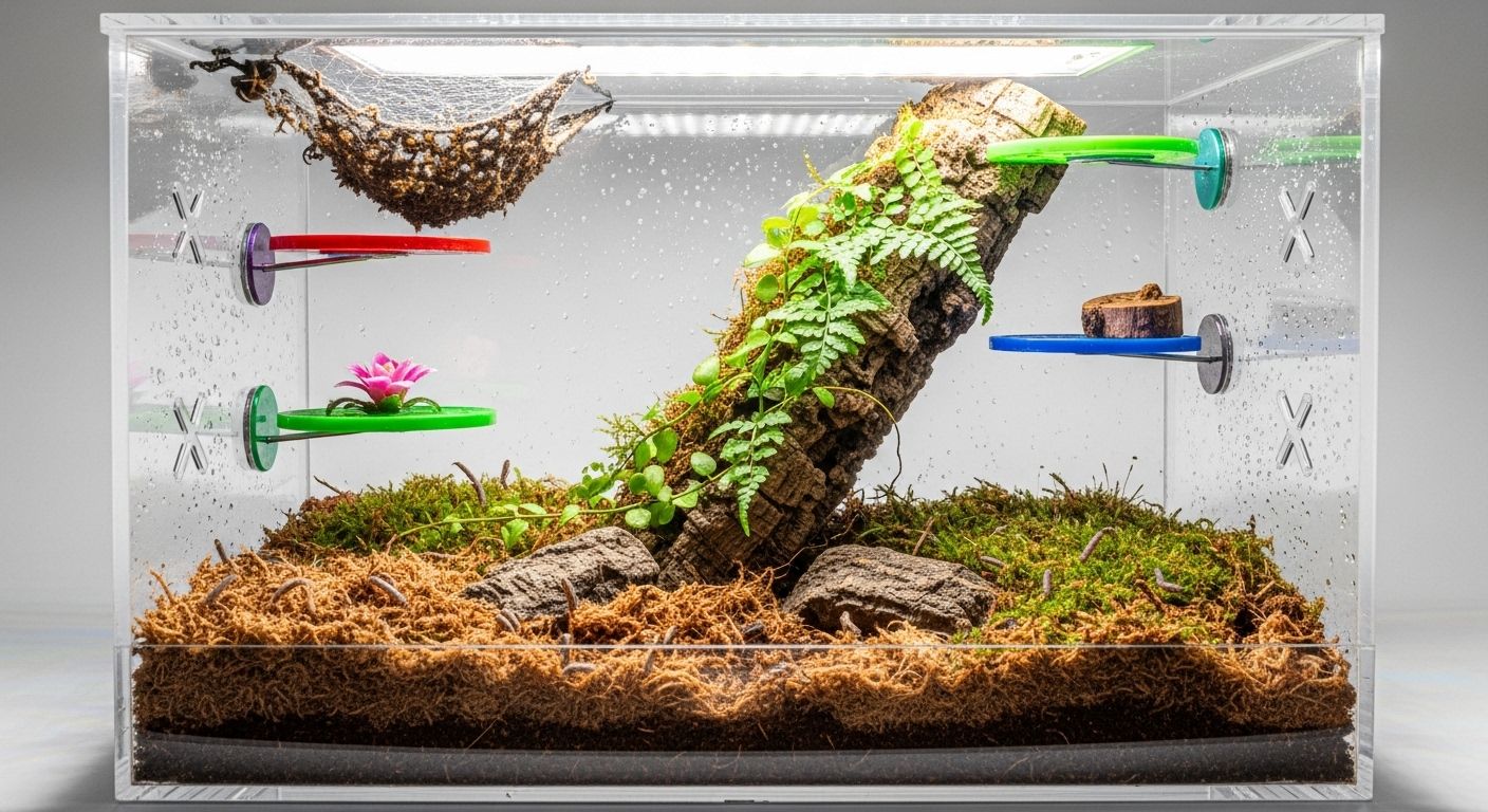 Because Regal Jumping Spiders are arboreal (tree-dwelling), their enclosure must prioritize vertical space. A standard 6x6x9 inch or 8x8x12 inch acrylic terrarium is ideal for an adult. Here are the critical components of a successful setup: